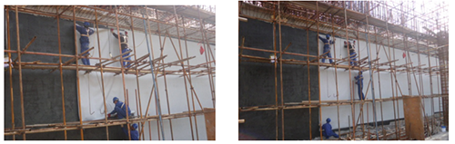 卷材由上至下鋪設(shè) ,將卷材與墻面緊密粘合