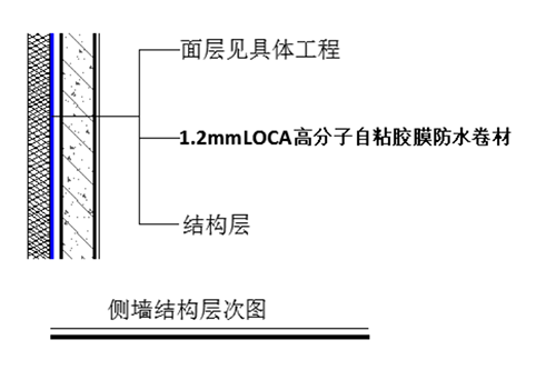 基層清理鋪設(shè)LOCA-100高分子自粘膠膜防水卷材一塔接邊密封一檢查驗(yàn)收注,預(yù)鋪反粘施工,卷材覆砂面朝上,平面及搭接采用專用膠帶粘貼固定,立面采用固定件機(jī)械固定,