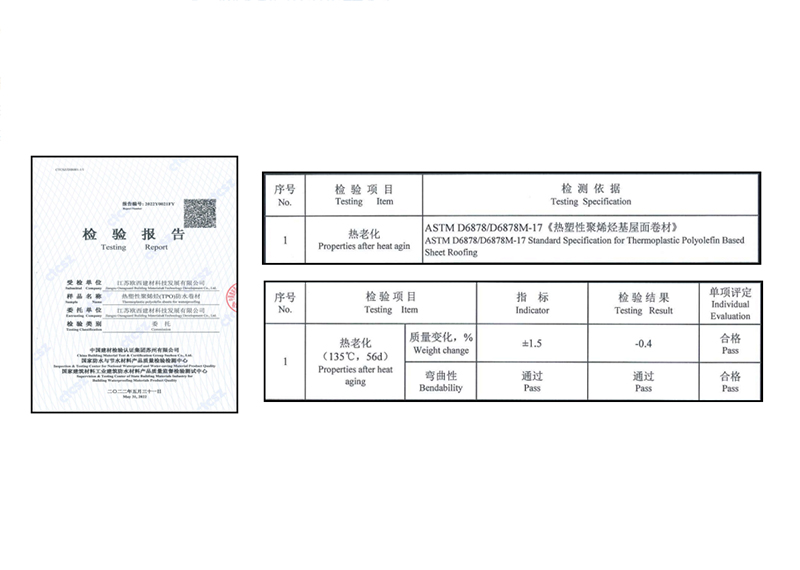 歐西TPO產品具有優異的熱老化性能。根據美國材料與試驗協會(American Society for Testing and Materials)相關研究并結合大量工程調查發現,TPO卷材的失效很多都是由于高溫導致,熱老化后卷材表層的TPO涂層一旦開裂不能保持水密性,將導致熱防水層的失效,所以熱老化性能對TPO卷材耐久性有著至關重要的影響。歐西TPO產品熱老化性能已通過了嚴苛的美標ASTM D6878相關檢測。美標中TPO卷材的熱老化測試條件要求135℃,56天,遠超國家標準要求的115℃,28天要求。