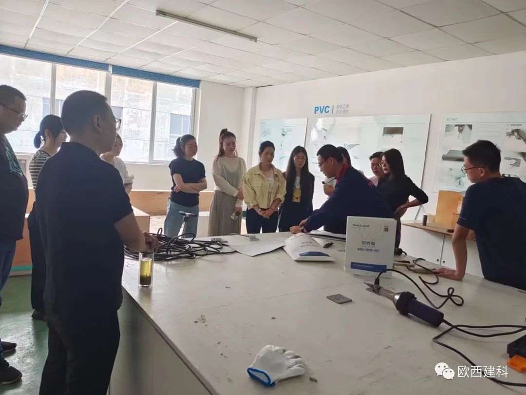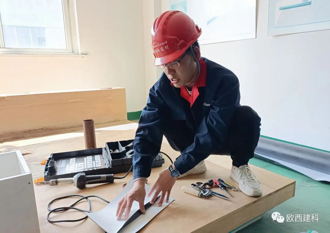 于經(jīng)理采取理論貫穿實(shí)操的教授方法,對(duì)歐西盾TPO防水卷材、LOCA預(yù)鋪反粘防水卷材作業(yè)標(biāo)準(zhǔn)化作業(yè)、安全標(biāo)準(zhǔn)化、質(zhì)量標(biāo)準(zhǔn)化等內(nèi)容進(jìn)行了系統(tǒng)講解,現(xiàn)場模擬實(shí)操正確流程及安全注意事項(xiàng),并結(jié)合實(shí)操演練對(duì)施工注意事項(xiàng)、焊槍及爬行焊機(jī)使用規(guī)范等內(nèi)容展開了培訓(xùn)等營銷人員通過接受專業(yè)實(shí)操訓(xùn)練,使大家更加直觀的感受到防水卷材在施工中的一些細(xì)節(jié),如陰陽角、管道、通風(fēng)口及樁頭的做法,有效提高了大家的防水專業(yè)技能知知識(shí)。