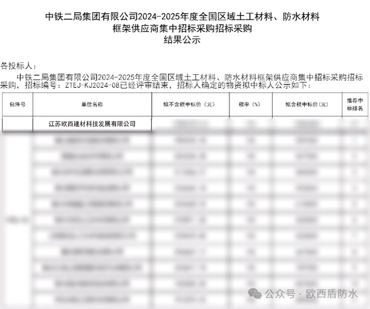 近日,中鐵二局集團有限公司完成了2024—2025年度全國區域土工材料、防水材料框架供應商集中招標采購招標,并公示了相關結果,其中,江蘇歐西建材科技發展有限公司成功入列。