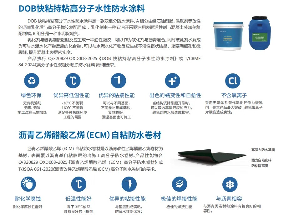 OXD復合防水系統是我司推出的新型卷涂復合防水系統,采用了我司自主研發的瀝青乙烯醋酸乙烯(ECM)防水卷材與DOB快粘持粘防水涂料進行結合,先采用噴涂工藝噴涂DOB快粘持粘防水涂料后,再采用自粘法施工將瀝青乙烯醋酸乙烯(ECM)防水卷材鋪貼在防水涂料上,采用熱風焊接法搭接的新型卷涂復合防水系統。