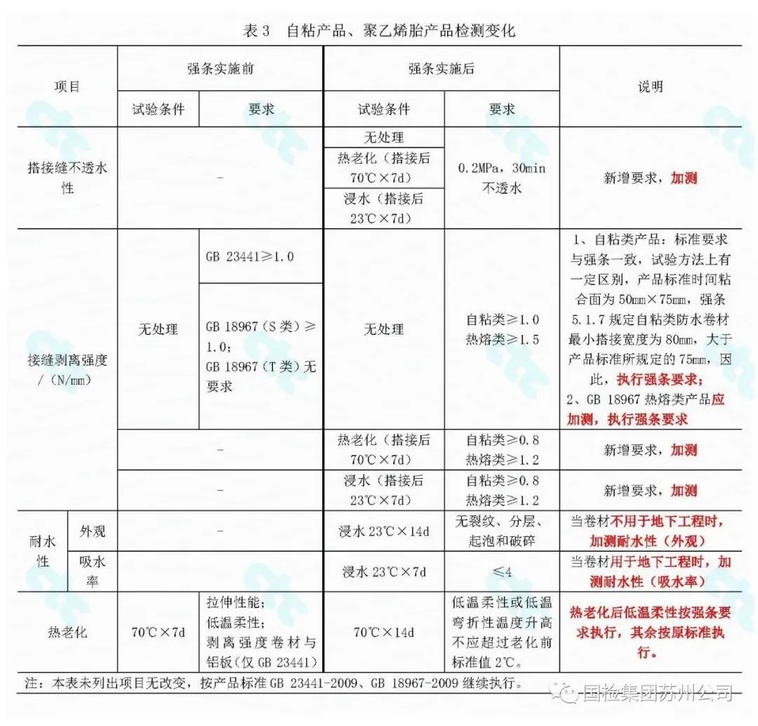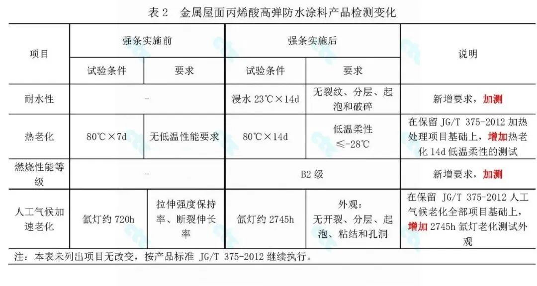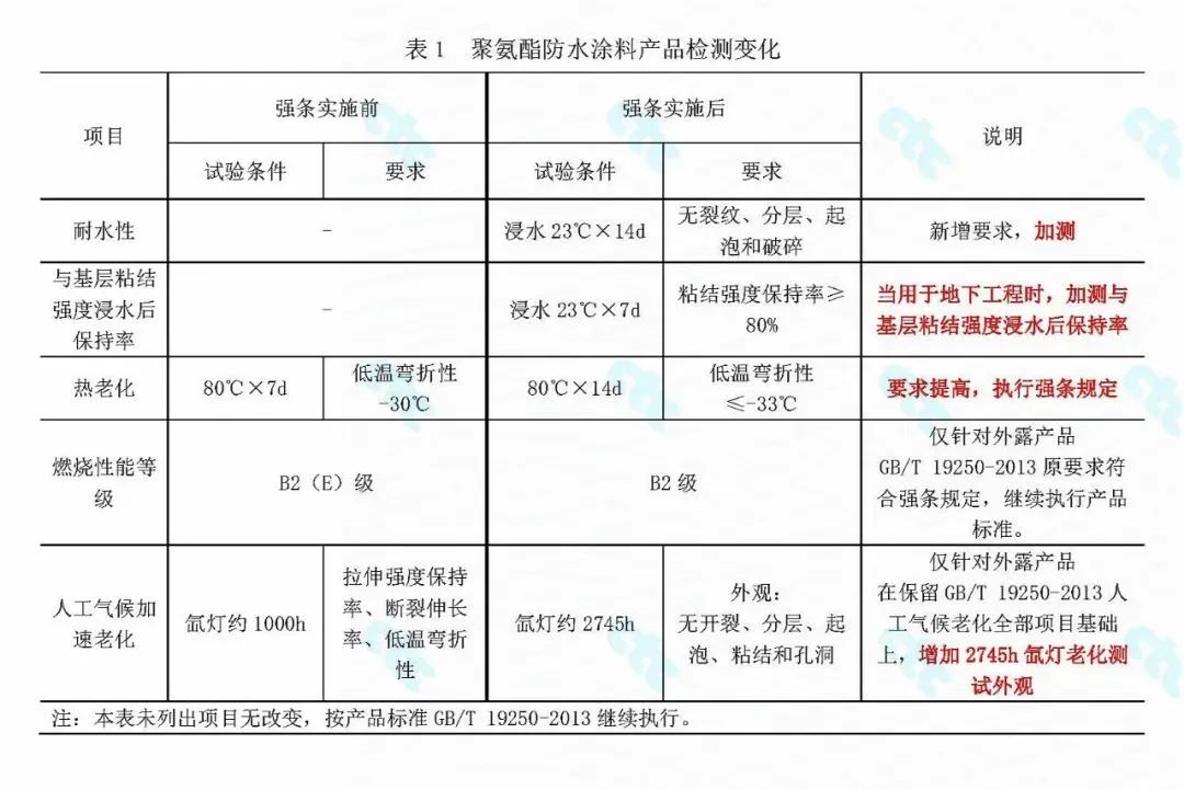 GB/T 23445—2009《聚合物水泥防水涂料》規定了“粘結強度(浸水處理)”的要求,但與強條提出的“與基層粘結強度浸水后保持率”項目并不能等同使用。要求上產品標準規定了限值,強條要求保持率;試驗方法上也不一致。強條的該項要求目前尚沒有明確的試驗方法。國檢集團蘇州公司在制定中國建筑防水協會團體標準《高耐水性聚合物水泥防水涂料》時已開展過大量基礎研究。
