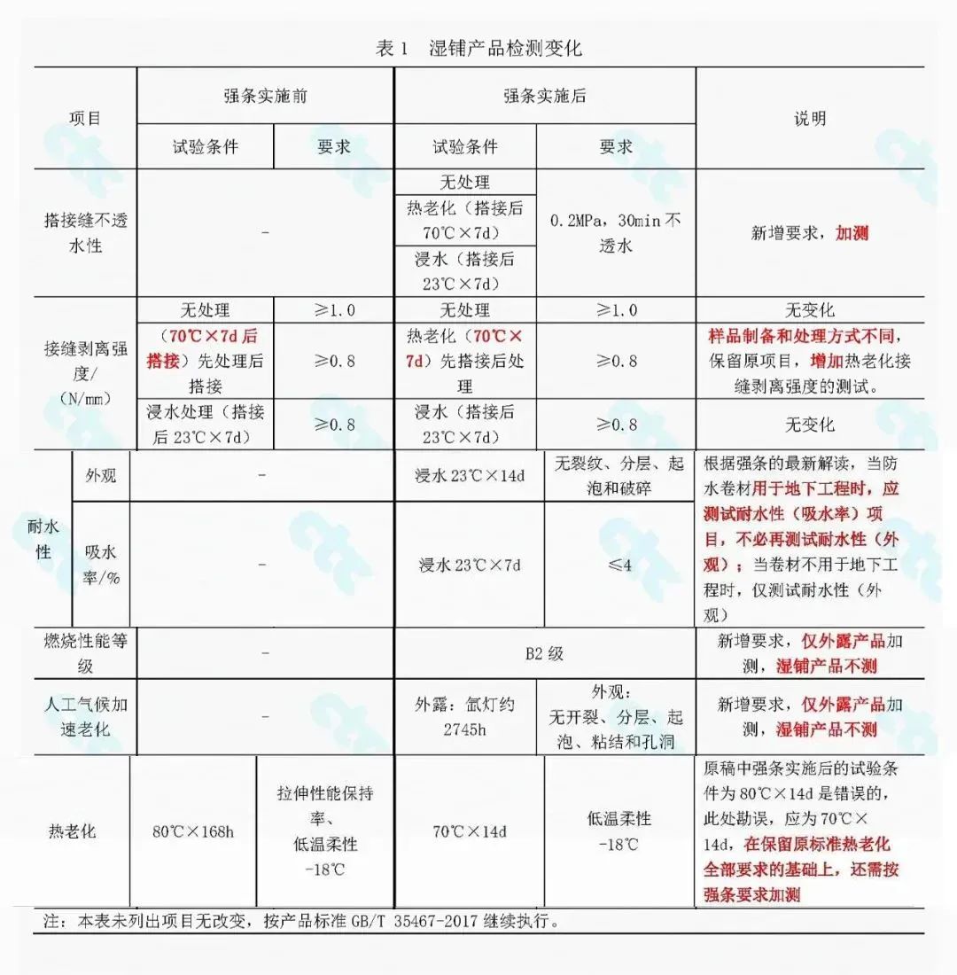 濕鋪防水卷材(執行標準為GB/T 35467—2017《濕鋪防水卷材》),濕鋪防水卷材與自粘防水卷材類似,均是以聚合物改性瀝青為主體材料的冷粘鋪貼防水卷材,并不適合外露使用,因此不涉及強條規定外露使用的相關要求。濕鋪卷材作為自粘搭接的產品,應重點關注和驗證強條提出的搭接縫性能要求。